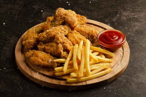 Chicken wings that have been deep-fried and served with crispy french fries.